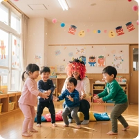 - 個々の違いを認め合いながら、社会性や生活習慣の自立、言葉のやり取り、知的な探求心を自然に獲得していきます。